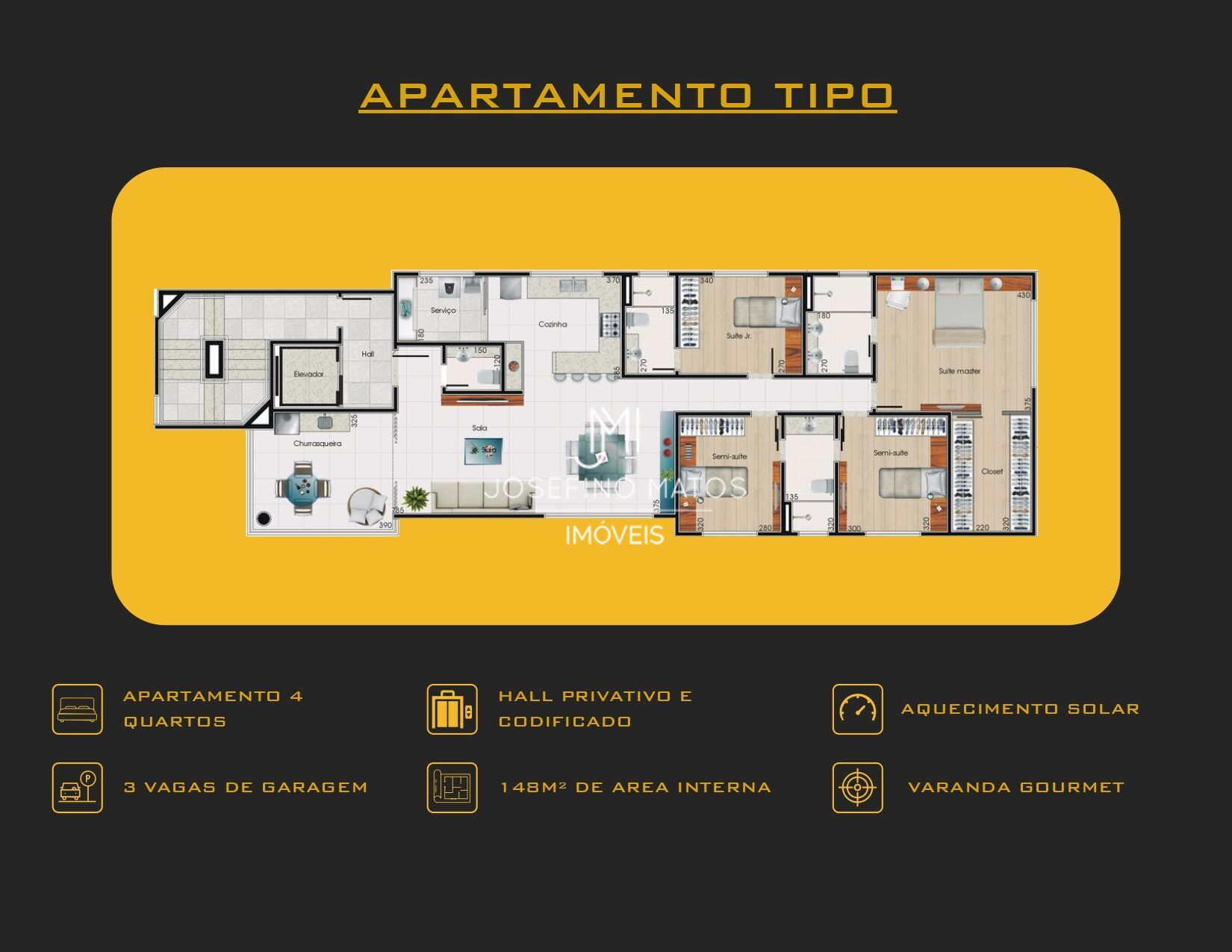 4 quartos, sendo 01 suíte master, 01 júnior e 2 semissuítes;