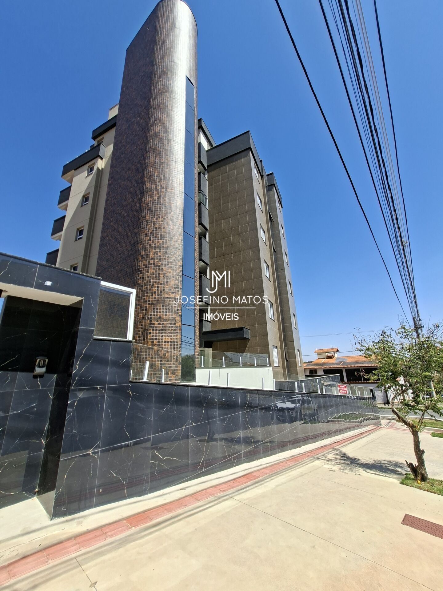 Prédio novo com apenas 12 unidades, fachada revestida com detalhe em vidro.