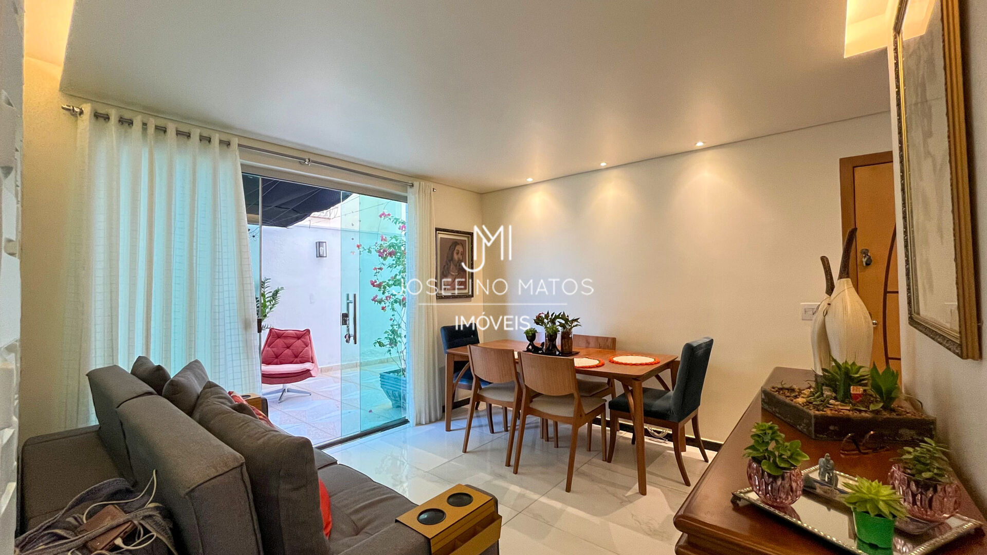 Possui Sala ampla para dois ambientes, com piso em porcelanato, iluminação planejada e teto rebaixado, proporcionando um ambiente elegante e aconchegante.
