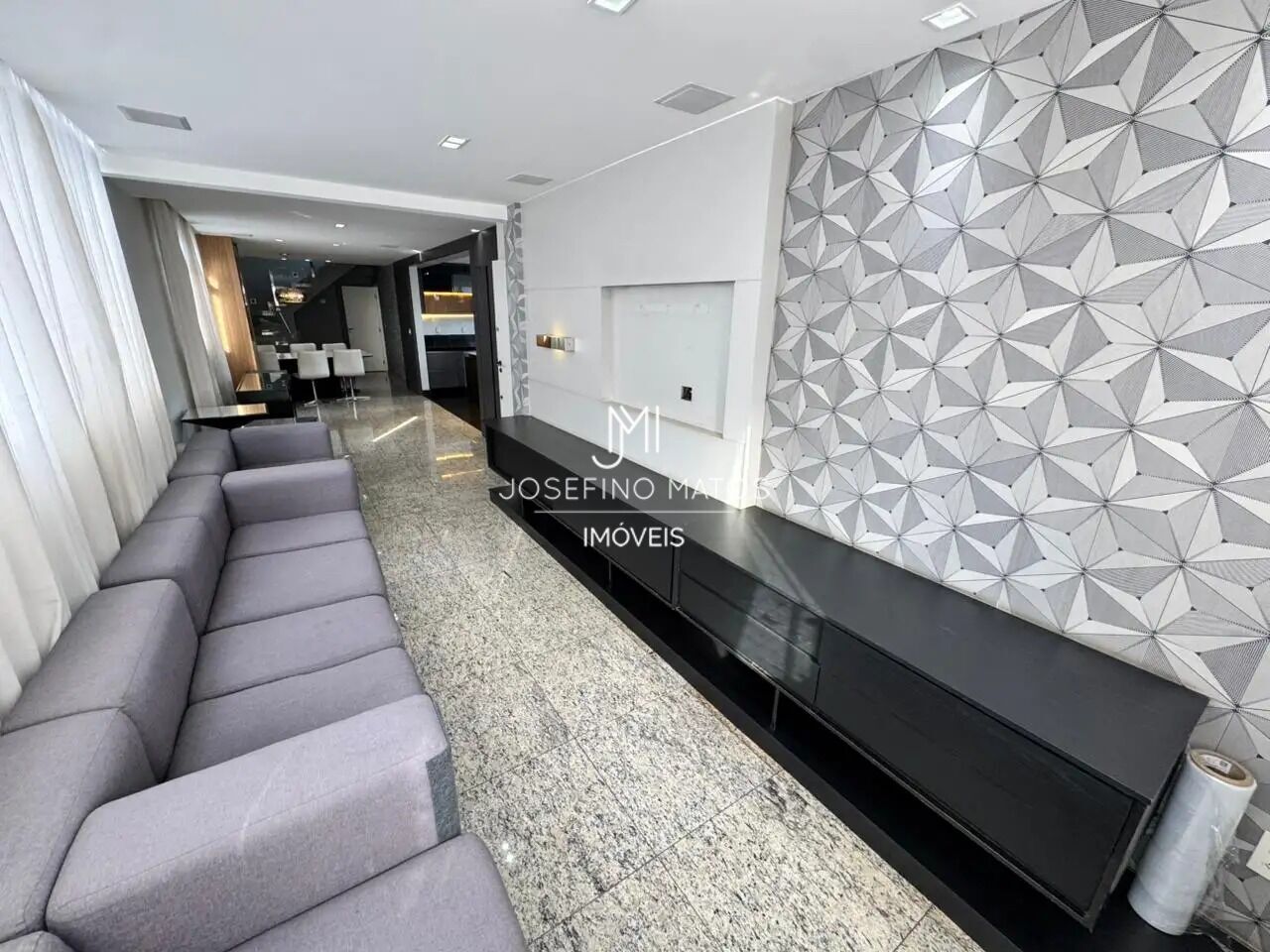 Ampla sala de TV com rebaixamento em gesso, iluminação planejada e piso em granito